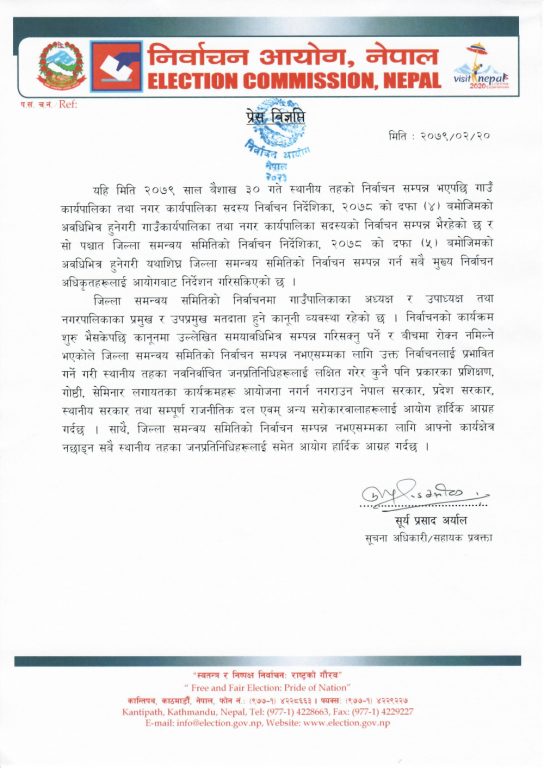 आयोगका सूचना अधिकारी सूर्यप्रसाद अर्यालले विज्ञप्ति जारी गरी जिससको चुनाव नसकिँदासम्म जनप्रतिनिधिलाई लक्षित गरी कुनै कार्यक्रम नराख्न पनि आग्रह गरेको छ ।