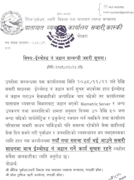 पोखरास्थित यातायात व्यवस्था कार्यालयले नयाँ र सरुवा दर्ता भई आउने सवारी साधनमा मात्र इम्बोस्ड नम्बर प्लेट दिन सकिने बताएको छ ।