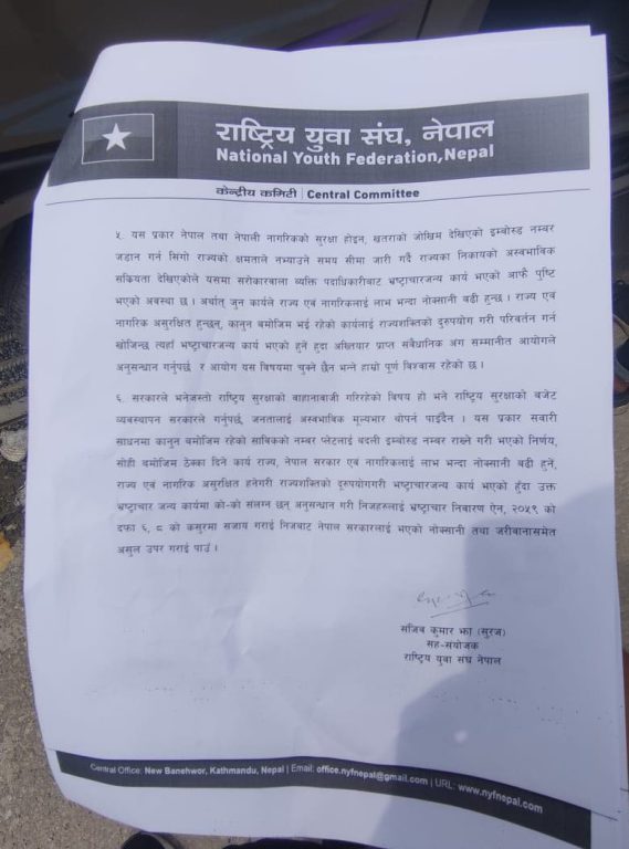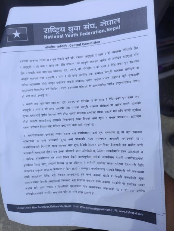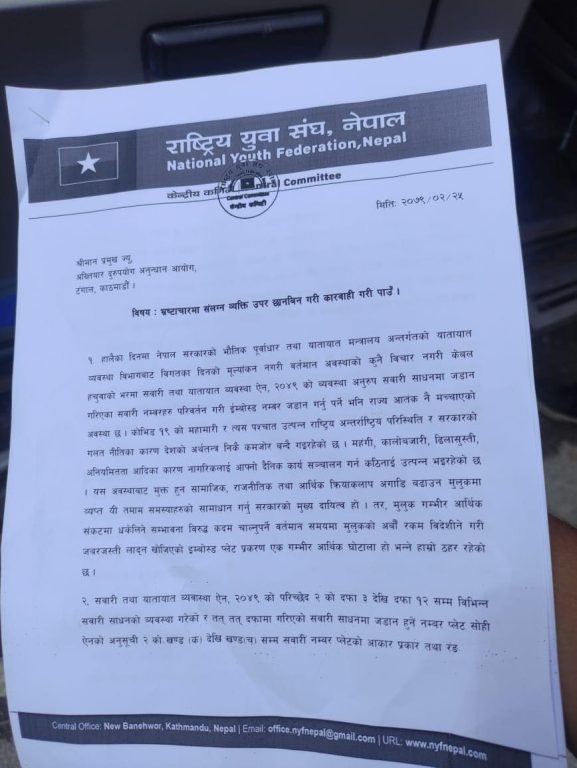 काठमाडौँ – राष्ट्रिय युवा संघ नेपालले इम्बोस्ड नम्बर प्लेटमा भएको अनियमितातको छानबिनको माग गर्दै अख्तियार दुरुपयोग अनुन्धान आयोग, टंगाल, काठमाडौंमा उजुरी दिएको छ ।