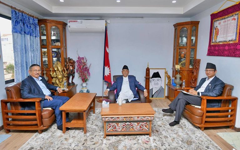 काठमाडौं -गृहमन्त्री बालकृष्ण खाँण र कानुनमन्त्री गोविन्द बन्दीले प्रमुख प्रतिपक्षी नेकपा एमालेका अध्यक्ष केपी शर्मा ओलीलाई भेटेका छन् ।