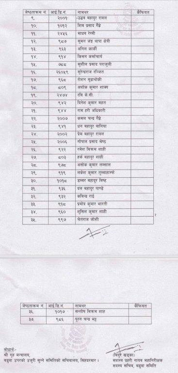 त्यसैगरी लकेशकुमार तुम्बाहाम्फे, डम्बरबहादुर विष्ट, दलबहादुर पाण्डे, कविन्द्र राई, प्रमोदकुमार भारती, सुनिल कुमार शाही, चेतराज जोशी, सन्तोष विक्रम साह र पुरन चन्द्र भट्ट पनि एसपीमा बढुवाको लागि सिफारिस भएका छन्।