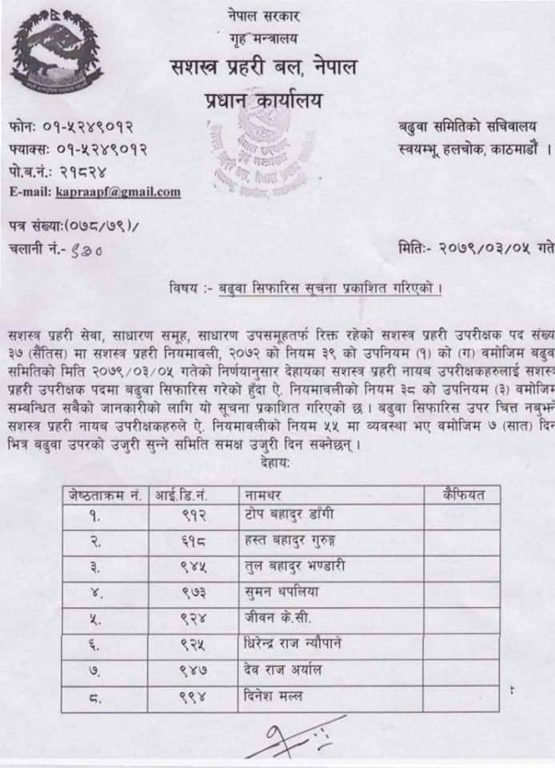 शसस्त्र प्रहरी बलका प्रवक्त डिआइजी विदुर खड्काकाले जारी गरेको विज्ञप्तीका अनुसार उनीहरुलाई बढुवाका लागि गृह मन्त्रालयमा सिफारिस गरिएको हो ।