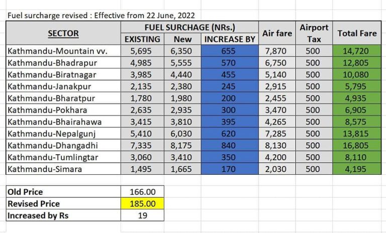 बढेको भाडा अनुसार काठमाडौंबाट धनगढी जानु पर्दा १६ हजार ८ सय ५ रुपैंया तिर्नुपर्दछ । यस्तै काठमाडौं नेपालगञ्जको १३ हजार ८ सय १५ रुपैंया पुगेको छ भने काठमाडौं भद्रपुर १२ हजार ८ सय ५ पुगेको छ । माउण्टेन फ्लाइटको १४ हजार ७ सय २० रुपैंया पुगेको वायु सेवा सञ्चालक संघले जनाएको छ ।