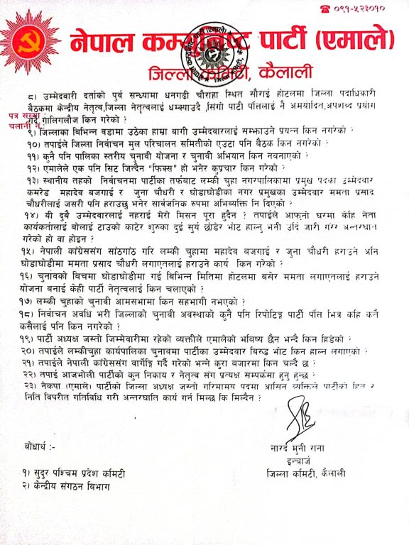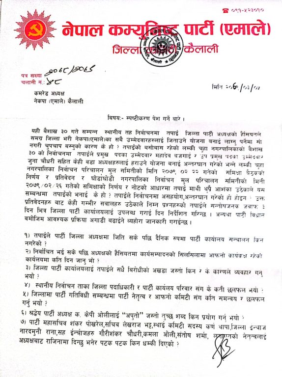 पार्टीका केन्द्रीय सदस्य एवं जिल्ला इन्चार्ज नारदमुनी रानाले जिल्ला अध्यक्ष रतन थापालाई जिल्लाका विभिन्न उम्मेदवार हराउन भूमिका निर्वाह गरेको भन्दै स्पष्टिकरण दिन काट्नु भएको छ । पार्टी अध्यक्ष थापाले निर्वाचनमा एमलेले एक सिट पनि जित्दैन भन्दै हिडेको,ममता प्रसाद चैधरी,महादेव बजगाईं र जुना चौधरीलाई हराउछु भनेर सार्वजनिक ठाउँमा भन्दै हिडेको किन भनेर स्पटिकरण सोधिएको छ । यसैगरी पार्टी अध्यक्ष केपी शर्मा ओलीलाई व्यक्तिगत लाञ्छना लगाएको महासचिव शंकर पोखरेल देखि केन्द्रीय सदस्य कमला ओलीसम्मका नेतालाई राजिनामा दिन लगाउछु भन्दै चुनाव माहोल भाँडेको लगाएका आरोप लगाउदै त्यसको स्पष्टिकरण माग गरिएको छ ।