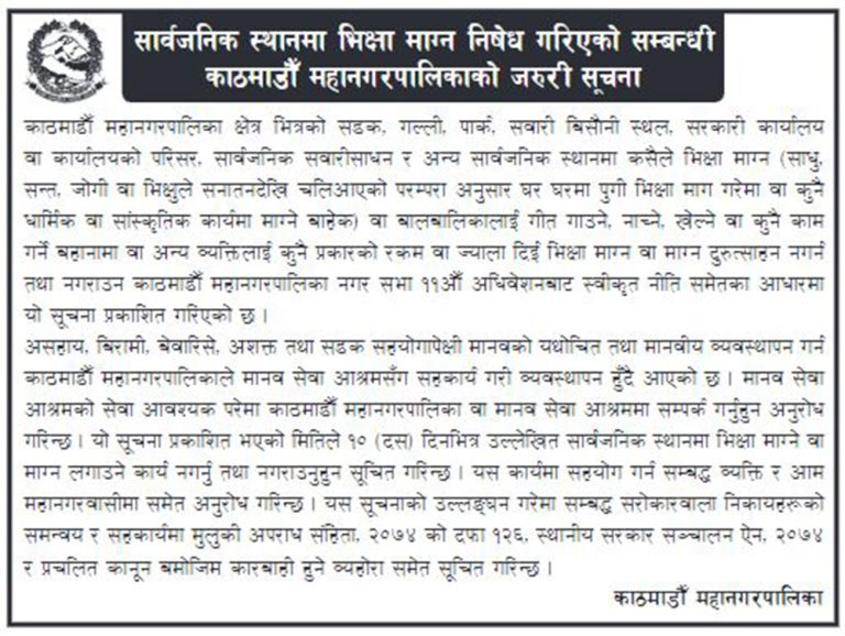सूचना अनुसार अब काठमाडौं महानगरभित्रका क्षेत्रमा भिख माग्न पाइने छैन । महानगरपालिकाले एक सूचना निकालेर महानगर क्षेत्रभित्रका सडक, गल्ली, पार्क, बस बिसौनी, सरकारी कार्यालय परिसर, सार्वजनिक गाडी र अन्य सार्वजनिक ठाउँमा भीख माग्न निषेध गरेको हो ।