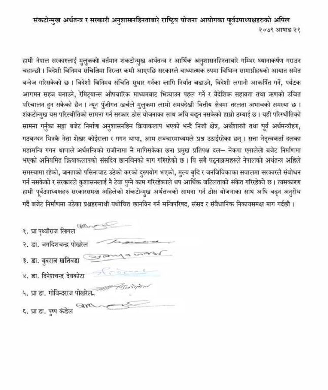 पृथ्वीराज लिगल, जगदीशचन्द्र पोखरेल, युवराज खतिवडा, दिनेशचन्द्र देवकोटा, गोविन्दराज पोखरेल र पुष्प कँडेलले मंगलबार संयुक्त विज्ञप्ति निकालेर संकोटोन्मुख अर्थतन्त्रको सामना गर्न सरकारले ठोस योजना ल्याउनुपर्ने पनि बताएका छन्।