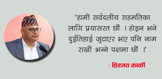 एमालेले गठन गरेको सहजिकरण समितीका संयोजक हिक्मत कार्की कोशी नाममा सहमत गराउन सबै दलहरूसँग छलफल भइरहेको बताउनुहुन्छ । ‘कांग्रेस पहिला जस्तै उत्साही भएर छलफलमा आए सजिलै टुंगो लाग्छ’ कार्कीले यो बेलासँग भन्नुभयो ‘हामी सर्वदलीय सहमतीका लागि प्रयासरत छौं । होइन भने दुईतिहाई जुटाएर भए पनि नाम राखौं भन्ने पक्षमा छौं ।’