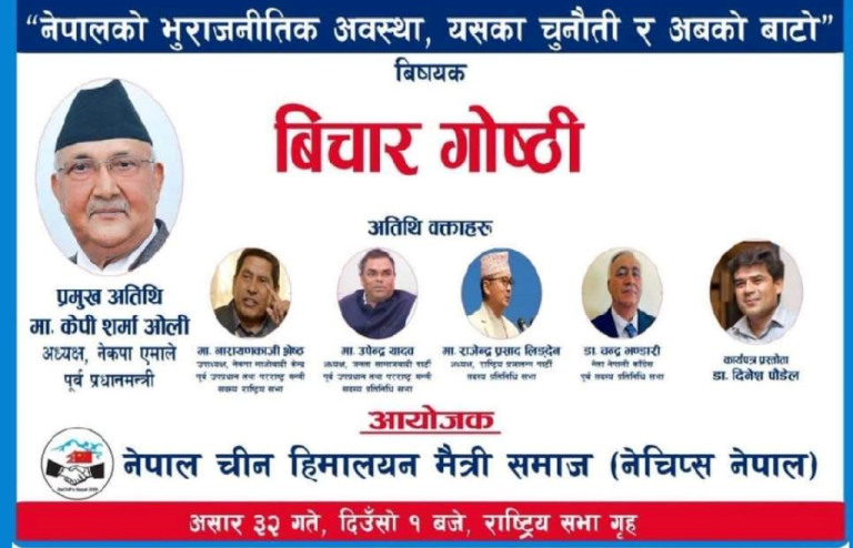 काठमाडौ- नेपाल एक चीन नीतिबाट विचलित भएको टिप्पणी भइरहेका बेला नेपाल चीन हिमालयन मैत्री समाजले भूराजनीतिक अवस्थाका बारेमा शीर्ष नेताहरुलाई एकै स्थानमा उभ्याएर बहश गर्न लागेको छ ।
