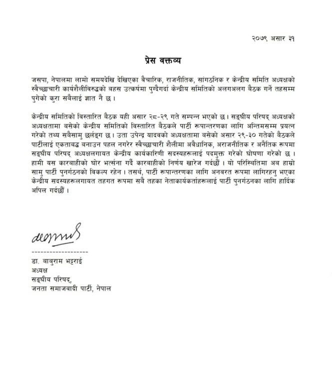 आन्तरिक विवाद केन्द्रीय समितिका बैठक नै अलग अलग बस्ने अवस्थामा पुगेकाले अब पार्टी पुनर्गठनको विकल्प नरहेको भट्टराईको विज्ञप्तीमा उल्लेख छ । त्यसका लागि तयार रहन उनले पार्टीका नेता–कार्यकर्तालाई अपिल गर्नुभएको छ ।
