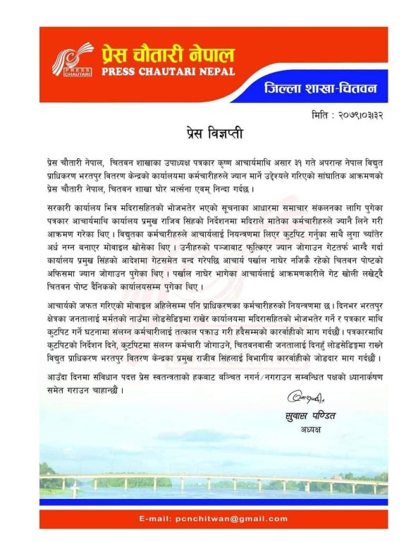 घटनाको निन्दा गर्दै प्रेस चौतारी जिल्ला शाखा चितवनले विज्ञप्ती निकालेको छ । अध्यक्ष सुवास पण्डितले जारी गरेको विज्ञप्तीमा कार्यलयमा दिउसै मातेका कर्मचारीले पत्रकारलाई कुटपिट गर्नु निन्दनीय भएको उल्लेख छ । पत्रकार आचार्यलाई ज्यान मार्ने उद्धेश्यले आक्रमण गरिएकोले कार्यलय प्रमुख मनोज सिंहलाई विभागीय कारबाहीको माग गरिएको छ । मातेको जत्थाले पत्रकार आचार्यको लुटेको मोबाइल हालसम्म फिर्ता नदिएको उल्लेख छ । संविधान प्रदत्त प्रेस स्वतन्त्रताको हकलाई कुण्ठित हुने गरी भएको यस्तो हर्कतको चौतारीले निन्दा गरेको छ ।