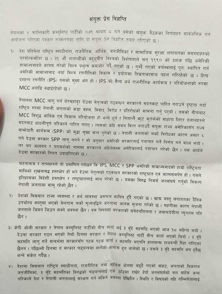 काठमाडौं – संसद बाहिरका साना चार कम्युनिष्ट पार्टीले अमेरिकी सहयता परियोजना (एमसीसी) र स्टेट पार्टनरसीप प्रोग्राम (एसपीपी) विरुद्ध आन्दोलन घोषणा गरेका छन् ।