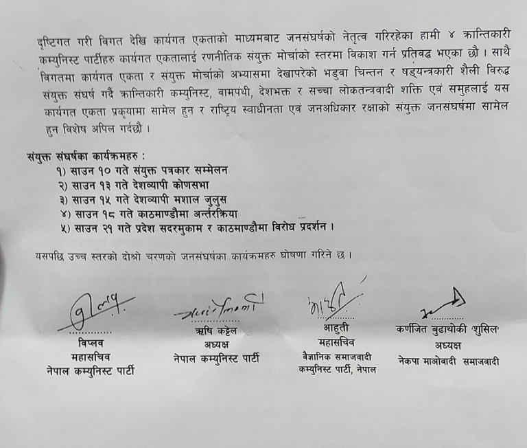 आज काठमाडौंमा संयुक्त पत्रकार सम्मेलन गरेर नेत्रबिक्रम चन्द विप्लव नेतृत्वको नेपाल कम्युनिष्ट पार्टी, ऋषि कट्टेल नेतृत्वको नेपाल कम्युनिष्ट पार्टी, आहुति नेतृृत्वको वैज्ञानिक समाजवादी कम्युनिष्ट पार्टी र कर्णजित बुढाथोकी नेतृत्वको नेकपा माओवादी समाजवादीले आन्दोलनको घोषणा गरेका हुन् ।