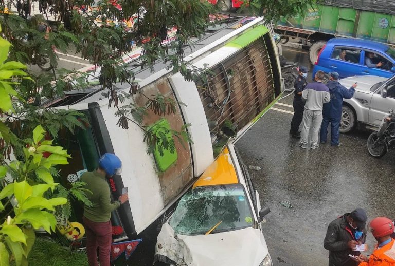 ललितपुर – ललितपुरको ग्वार्कोमा ट्याक्सीमाथि बस पल्टिएको छ ।