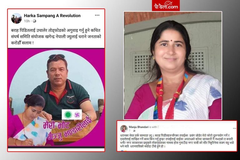 यो बेलासँग कुरा गर्दै भण्डारीले आफूलाई लोकप्रिय देखाउने नाममा अरुलाई लाञ्छित गर्न नहुने बताउनुभएको छ । ‘त्यसमा पनि सामाजिक सञ्जालबाट चुनावको बेला कार्यकर्ताले प्रयोग गरेको तस्विरलाई गलत अर्थ लाग्ने गरी बिल्कुल फरक प्रसंगमा प्रयोग गर्न सुहाउने कुरा होइन’ भण्डारीले भन्नुभयो ‘सधैं फेसबुक लाइभमा देखिने मेयरले साइबर कानुन पनि थाहा पाउनु प¥यो नि ।’