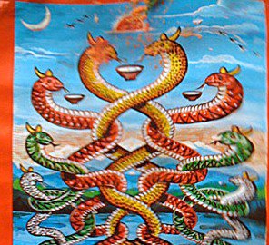 गुरू गोरखनाथले नौ नागको आसनमा बसी बाह्रवर्षसम्म तपस्या गरेको र यसरी नागलाई थिचेर राख्दा पानी नपरेकाले गोरखनाथका गुरूप मत्स्येन्द्रनाथलाई नेपाल बोलाइयो । गुरू आएको देखी गोरखनाथ उठेपछि नाग मुक्त भएर पानी वर्षाएको प्रसङ्ग पनि धर्मशास्त्रमा उल्लेख छ ।