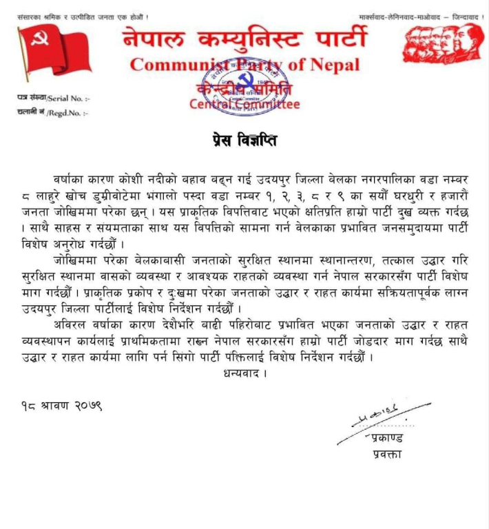 अविरल वर्षाका कारण देशैभरि बाढी पहिरोबाट प्रभावित भएका जनताको उद्धार र राहत व्यवस्थापनलाई प्राथमिकतामा राख्न नेपाल सरकारसँग नेपाल कम्युनिष्ट पार्टीले माग पनि गरेको छ ।