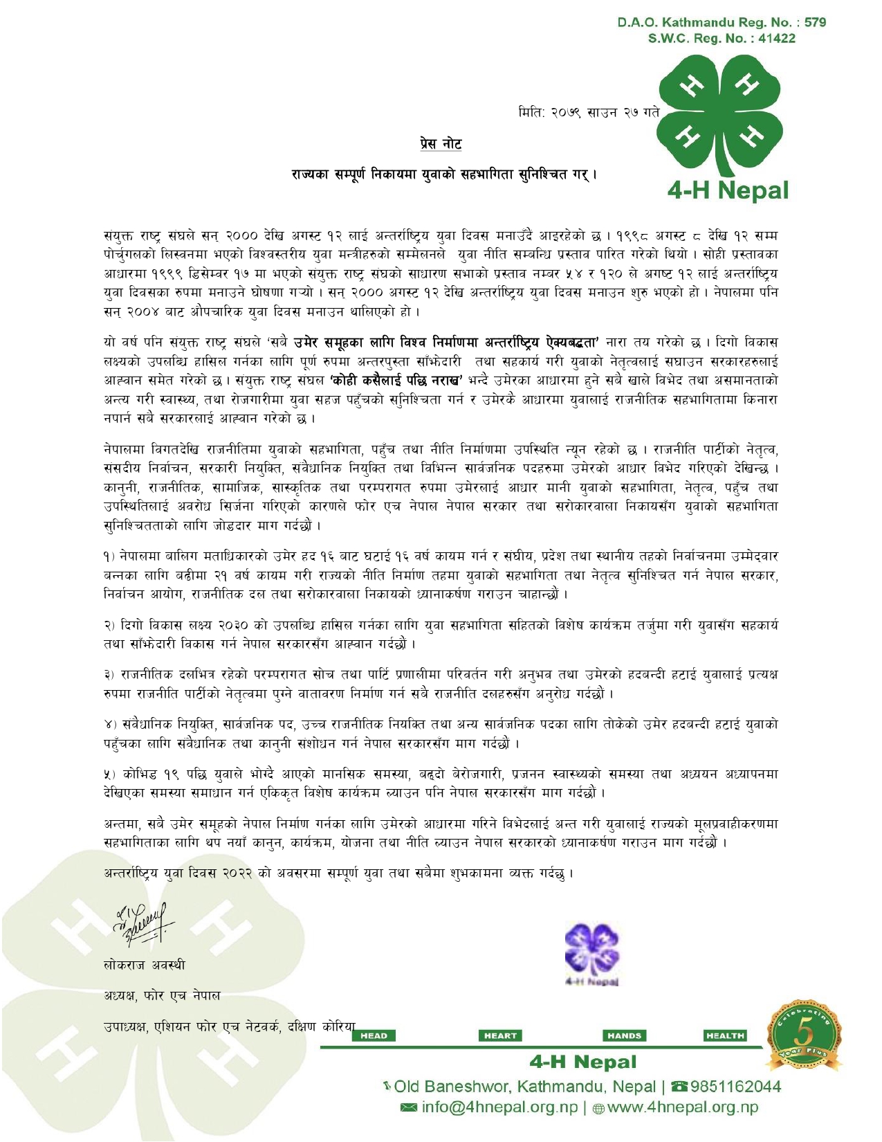 फोर एच नेपालका अध्यक्ष लोकराज अवस्थीद्वारा जारी गरिएको वक्तव्यमा भनिएको छ, संवैधानिक नियुक्ति, सार्वजनिक पद, उच्च राजनीतिक नियक्ति तथा अन्य सार्वर्जनिक पदका लागि कायम गरिएको उमेर हदबन्दी हटाई युवाको पहुँचका लागि संवैधानिक तथा कानुनी संशोधन गर्न भनिएको छ । र, कोभिड १९ पछि युवाले भोग्दै आएको मानसिक समस्या, बेरोजगारी, प्रजनन स्वास्थ्यको समस्या तथा अध्ययन अध्यापन लगायतका समस्या समाधान गर्न एकिकृत विशेष कार्यक्रम ल्याउन नेपाल सरकारसँग माग गरेको छ ।