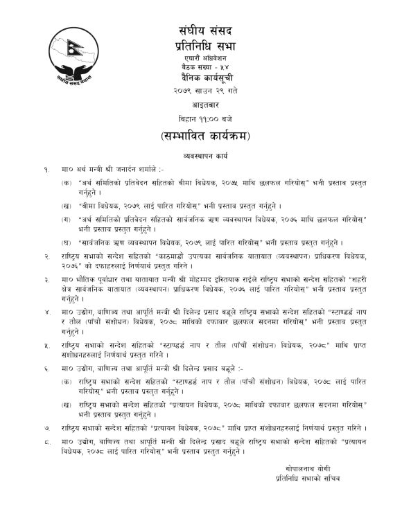 अर्थमन्त्री शर्माले नै ‘बिमा विधेयक, २०७९ लाई पारित गरियोस्’ भनी प्रस्ताव प्रस्तुत गर्ने, ‘अर्थ समितिको प्रतिवेदनसहितको सार्वजनिक ऋण व्यवस्थापन विधेयक, २०७६ माथि छलफल गरियोस्’ भनी प्रस्ताव प्रस्तुत गर्ने र ‘सार्वजनिक ऋण व्यवस्थापन विधेयक, २०७९ लाई पारित गरियोस्’ भनी प्रस्ताव प्रस्तुत गर्नेछन् ।