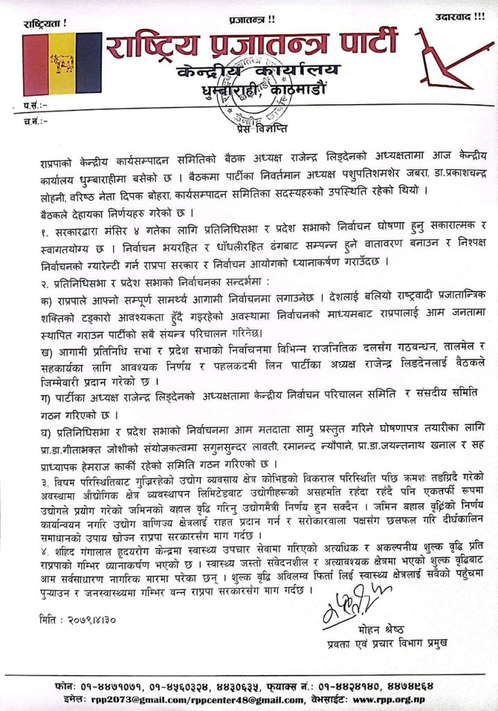 केन्द्रीय कार्यालय धुम्बाराहीमा पार्टीका निवर्तमान अध्यक्ष पशुपतिशमशेर जबरा, डा. प्रकाशचन्द्र लोहनी, वरिष्ठ नेता दिपक बोहरा लगायतको उपस्थितिमा बसेको बैठकले निर्वाचन भयरहित र धाँधलीरहित ढंगबाट सम्पन्न हुने वातावरण बनाउन पनि सरकार र निर्वाचन आयोगलाई आग्रह गरेको छ।