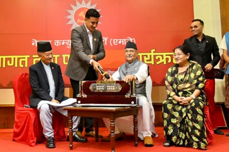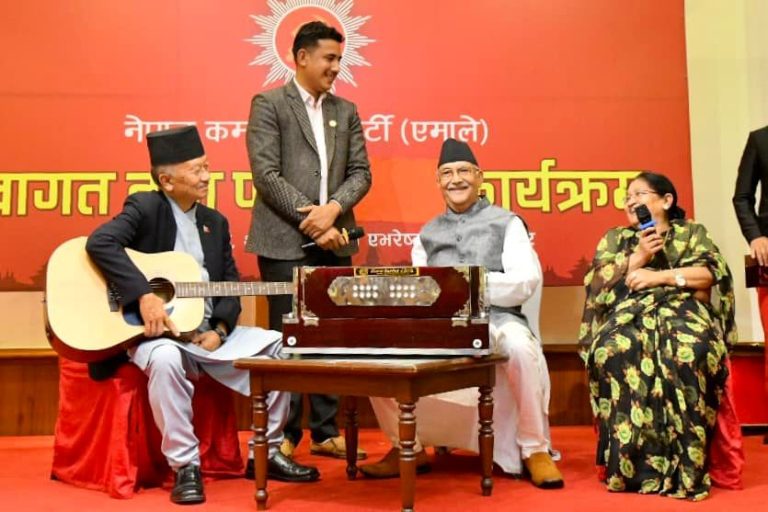काठमाडौं -नेकपा एमालेको उद्योग तथा व्यावशाय विभागले आज होटल एभरेष्टमा तिज कार्यक्रम आयोजना गर्यो । कार्यक्रममा अधयक्ष केपी शर्मा ओलीले हारमोनियम र गीतार बजाएको दृष्य रोचक थियो । त्यो भन्दा रोचक त उपाध्यक्ष सुवासचन्द्र नेम्वाङले गीतार बजाउन नजानेपछि अध्यक्ष ओलीले खोसेर बजाएको दृष्यले सहभागी केन्द्रीय सदस्यहरुले रमाइलो मानेर हेरेका थिए ।