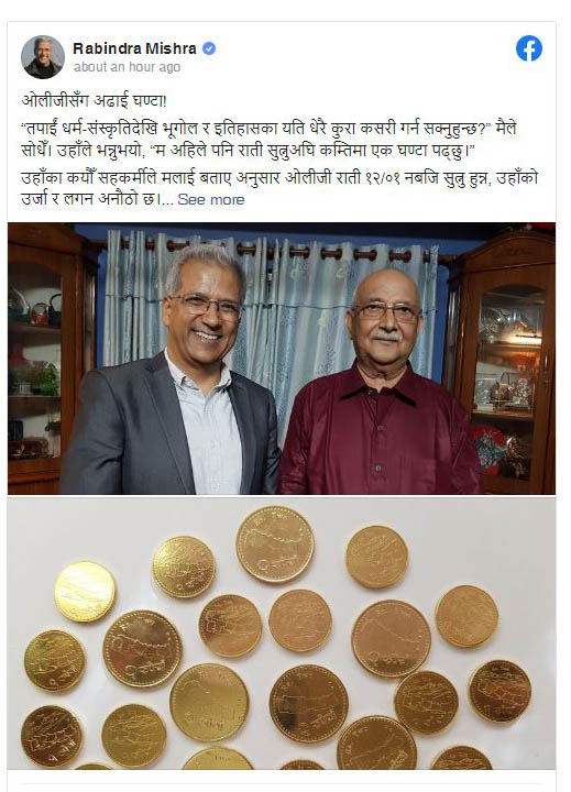 अध्यक्ष ओलीले ‘तपाईं चेस खेलेर आएको मान्छे अहिले बास्केटबलको मैदानमा हुनुहुन्छ, जहाँ छलछाम, घम्साघम्सी सबै हुन्छ। नआत्तिनु होला’ भनेर सुझाव दिएको मिश्रले बताउनुभयो । भेटको अन्त्यमा ओलीले आफू प्रधानमन्त्री हुँदा छाप्न लगाएका एक र दुई रुपैयाँको एक मुठ्ठी सिक्का उपहार दिएको तस्बिरसहित मिश्रले फेसबुकमा राख्नुभएको छ ।