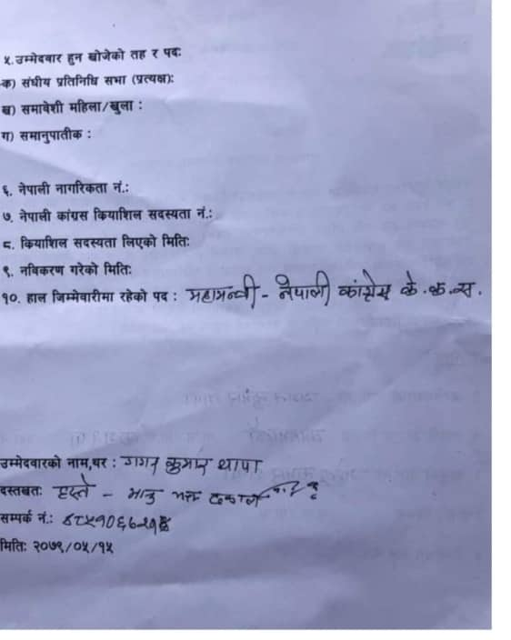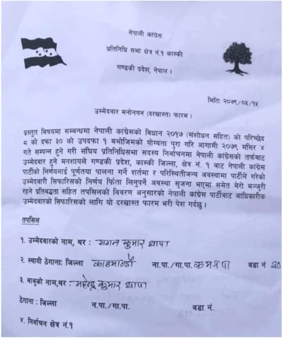 महामन्त्री थापाले भन्नुभयो, ‘म काठमाडौँ–४ मै लड्छु। यता कसैले आवेदन मागेको छैन। मैले दिएको पनि छैन। तर, मेरो नाम सिफारिस भैहाल्छ । कास्की १ बाट मनोनयन फारम दर्ता गरिएको बारेमा केही जानकारी छैन।’