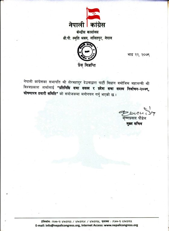 पार्टी सभापति शेरबहादुर देउवाले महामन्त्री शर्मालाई चुनावी घोषणापत्र तयारी समितिको संयोजक तोक्नु भएको हो ।