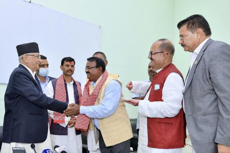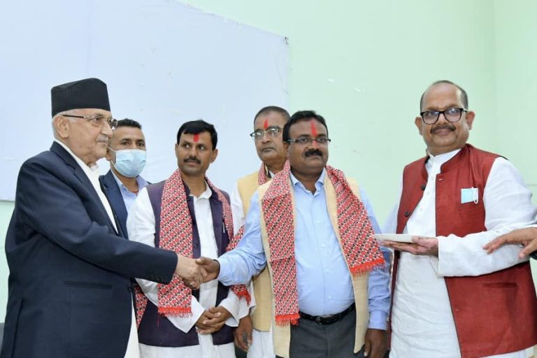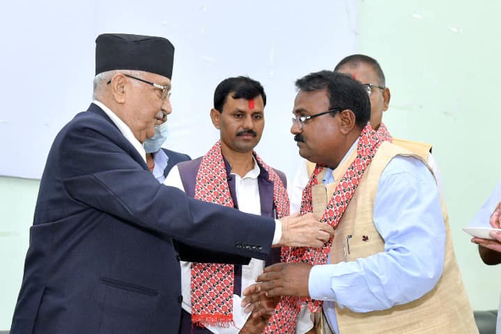 अध्यक्ष केपी शर्मा ओलीले पार्टीको केन्द्रीय कार्यालय, च्यासल, ललितपुरमा आज आयोजित कार्यक्रममा उहाँहरूलाई खादा लगाई स्वागत गर्नुभयो ।