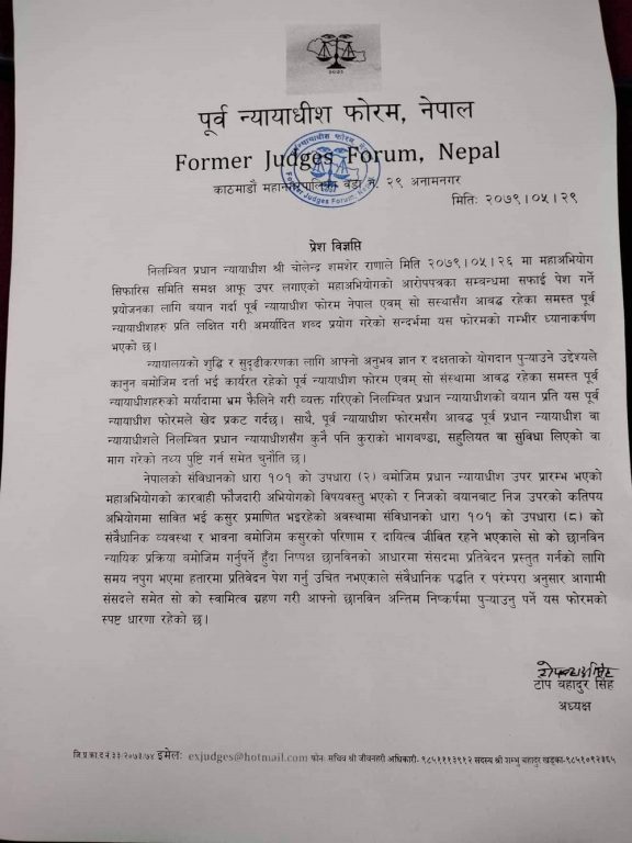 विज्ञप्तिमा भनिएको छ, ‘पूर्वन्यायाधीश फोरमसँग आबद्ध पूर्वप्रधानन्यायाधीश वा न्यायाधीशले निलम्बित प्रधानन्यायाधीशसँग कुनै पनि कुराको भागबण्डा, सहुलियत वा सुविधा लिएको वा माग गरेको तथ्य पुष्टि गर्न समेत चुनौती छ।’
