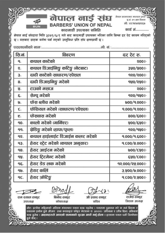 यसअघि १५० रुपैयाँ रहेकोमा ५० रुपैयाँ शुल्क बढाइएको हो । संघका अनुसार दाह्री काटेको १२० देखि १५० रुपैयाँ निर्धारण गरिएको छ । टाउको मसाजको २०० रुपैयाँ, स्याम्पु गरेको १२० देखि १५० रुपैयाँ शुल्क तोकिएको छ ।