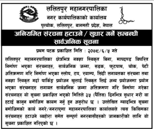 ललितपुर-ललितपुर महानगरपालिकाले अवैध संरचना हटाउन निर्देशन दिएको छ । महानगरपालिकाले आज ३५ दिने सार्वजनिक सूचना प्रकाशन गर्दै सार्वजनिक जग्गा मिचेर बनाइएका अवैध संरचना हटाउन निर्देशन दिएको हो ।