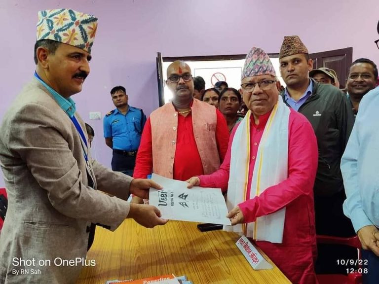 गौर नगरपालिकाका प्रमुख एवं नेकपा एकीकृत समाजवादी रौतहटका नेता शम्भु साहको प्रस्ताव तथा राजदेवी नगरपालिकाका प्रमुख एवं कम्युनिष्ट नेता भिखारीप्रसाद यादवको समर्थनमा पूर्व प्रधानमन्त्री नेपालले मनोनयन दर्ता गराउनुभएको मुख्य निर्वाचन अधिकृतको कार्यालयले जनाएको छ ।