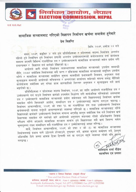 आयोगले सामाजिक सञ्जालमार्फत हुने सबै खर्चविवरण चुस्त दुरुस्त राख्न राजनीतिक दलहरु र उम्मेदवारहरुलाई आग्रह गरेको छ।