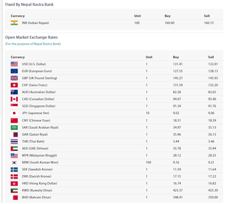 आज डलरको खरिद दर १३१ रुपैयाँ ४१ पैसा र बिक्री दर १३२ रुपैयाँ ०१ पैसा रहेको छ। युरो एकको खरिद दर १२७ रुपैयाँ ५५ पैसा र बिक्री दर १२८ रुपैयाँ १३ पैसा रहेको छ।