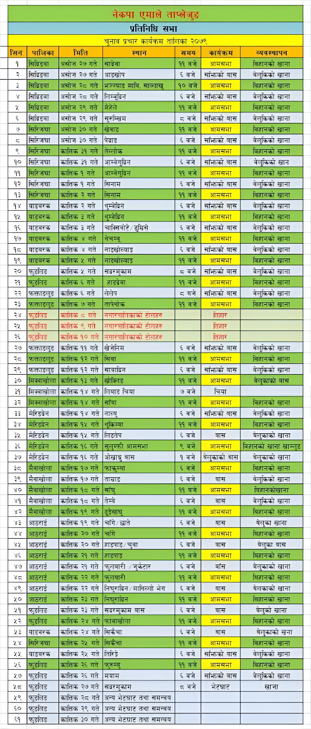 नेकपा एमाले ताप्लेजुङले चुनावी प्रचार-प्रसार कार्यक्रम ३३ दिनका लागि तय गरेको छ । एमाले जिल्ला कमिटीका अनुसार आज असोज २७ गतेबाट सादेवाबाट सुरु भएको कार्यक्रम कातिक ३० गते सदरमुकाम फुङलिङमा समापन हुनेछ । ‘तिहारको बेला पनि हामी उम्मेद्वारहरुलाई मतदातासँगको भेटघाटलाई निरन्तरता दिनेछौं’ पार्टी उपसचिव दिपेन पोमुले यो बेलासँग भन्नुभयो ‘संघीय र प्रदेशका तीनै जना उम्मेद्वारलाई आफ्नो निर्वाचन क्षेत्रमा अहोरात्र खटाउने र जनतासँग भेट गराउने हाम्रो तयारी छ ।’