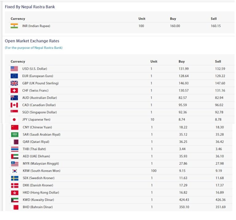 आज डलरको खरिद दर १३१ रुपैयाँ ९९ पैसा र बिक्री दर १३२ रुपैयाँ ५९ पैसा रहेको छ। युरो एकको खरिद दर १२८ रुपैयाँ ६४ पैसा र बिक्री दर १२९ रुपैयाँ २२ पैसा रहेको छ।