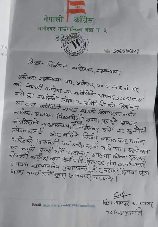 जिल्लाको भागेश्वर गाउँपालिका–५ को कांग्रेसको वडा समितिले वडाको समग्र विकासका लागि राखिएका मागहरू विश्वासिलो रुपमा पूरा हुने आधार नदेखिएकाले चुनाव बहिष्कार गर्ने निर्णय गरेको हो।