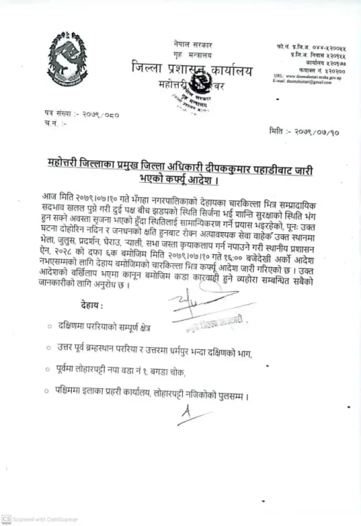 महोत्तरी-महोत्तरीको भङ्गाहा नगरपालिकामा धार्मिक सद्भाव भड्कन नदिन जिल्ला प्रशासन कार्यालय महोत्तरीले निषेधाज्ञा (कफ्र्यू) कायमै राखेको छ । भङ्गाहा–८ पडरिया बस्तीमा बिहीबार भड्केको दङ्गा नियन्त्रण गर्न जिल्ला प्रशासनले पडरिया वरपर क्षेत्र तोकेर निषेधाज्ञा जारी गरेको थियो । निषेधाज्ञा आज पनि जारी छ ।
