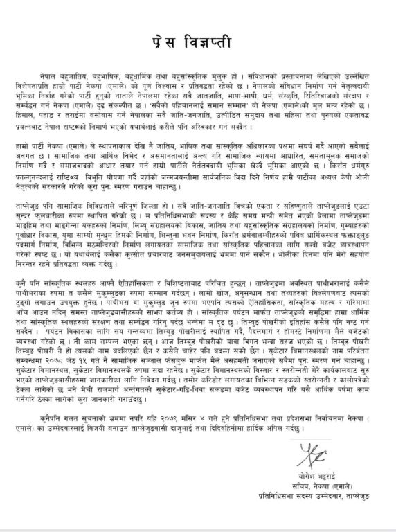 ताप्लेजुङ-नेकपा एमालेका सचिव तथा ताप्लेजुङ जिल्लाबाट प्रतिनिधी सभाका उम्मेदवार योगेश भट्टराईले आफूविरुद्ध भ्रामक सूचना प्रवाह नर्गन आग्रह गर्नुभएको छ । उहाँले विज्ञप्ति जारी गर्दै आफू विरुद्ध प्रचार गरिएका भ्रामक सूचनाहरूको पछि नलाग्न जिल्लावासीलाई आग्रह गर्नुभएको हो ।