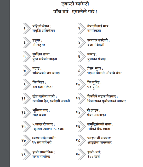 घोषणापत्रमा उल्लेख भएका २० ग्यारेन्टी यस प्रकार छन्