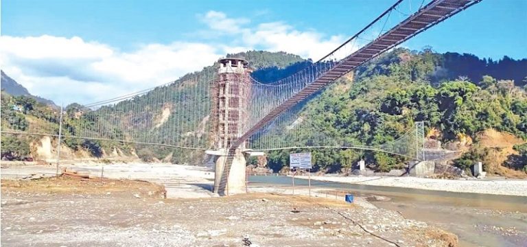 झोलुङ्गे पुलको शिलान्यास १५ मङ्सिर २०७१ मा तत्कालीन संविधानसभा सदस्य कांग्रेसका युवा नेता डा चन्द्र भण्डारीले गर्नुभएको थियो । तीन जिल्ला जोड्ने तीनमुखे पुलको परिकल्पना भने तत्कालीन मुख्यसचिव लिलामणि पौडेलले गर्नुभएको हो । पुल एसिया महादेशको पहिलो तीनमुखे झोलुङ्गे पुल भएको कांग्रेस नेता डा भण्डारीले बताउनुभयो । पुल मङ्सिर २०७१ बाट निर्माण सुरू भएको थियो ।
