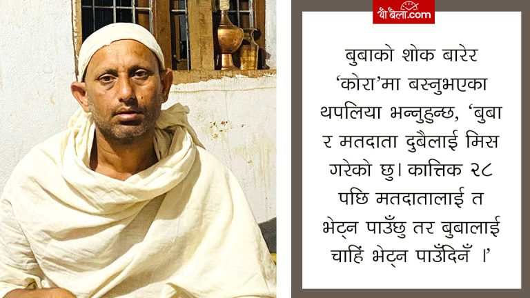 बुबाको निधन भएपछि परम्परा अनुसार उहाँ १३ दिनसम्म घर बाहिर निस्कन पाउनुभएको छैन । आज नवौं दिन जारी छ । अब चुनाव आउन पनि नौ दिन मात्र बाँकी छ । १३ दिनसम्म काजक्रियाको काम सकेर निस्कदा निर्वाचन प्रचार गर्न नपाइने समय ‘मौन अवधी’ सुरू हुन लागेको हुनेछ । ‘म मतदाताको घरघरमा जाने कुरा बुबाको निधनका कारण सम्भव भएन’ थपलिया भन्नुहुन्छ, ‘काजक्रियामा बसिरहँदा मैले एकै साथ दुईवटा कुरा मिस गरिरहेको छु । एउटा मेरो बुबालाई दोस्रो मेरा मतदातालाई। मतदातालाई त म काजक्रिया सकेपछि भेट्छु तर बुबालाई भेट्न सक्दिनँ ।’