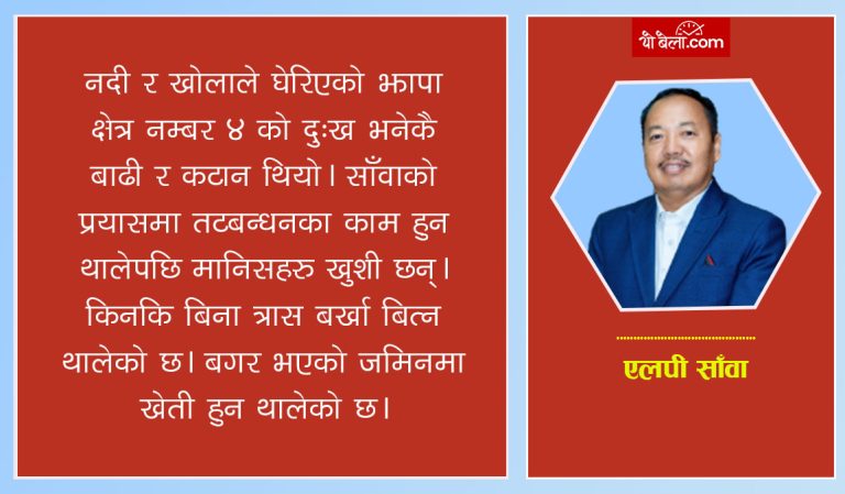 अधिकांश जनप्रतिनिधीहरुलाई लाग्ने आरोप भएको चुनाव पछि निर्वाचन क्षेत्रमा फर्किएर नै आउँदैनन् भन्ने हो । तर झापा क्षेत्र नं. ४ बाट निर्वाचित साँवालाई भने जव समस्या पर्छ, नागरिकले सम्झिहाल्छन् । त्यसैले जहाँ समस्या पर्छ, त्यहाँ साँवाको उपस्थिती पनि हुने गरेको छ । नदी कटानको समस्या समाधानका लागि होस् वा पुल–कलभर्ट नहँुदा जनताले पाएको सास्ति, समाधानमा उहाँ उत्तिनै खटिने गर्नु भएको छ । उहाँको पहल र प्रयासमा भएका योजनाकै कारण नागरिकको जीवन स्तरमा पनि परिवर्तन आएको छ ।