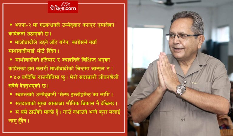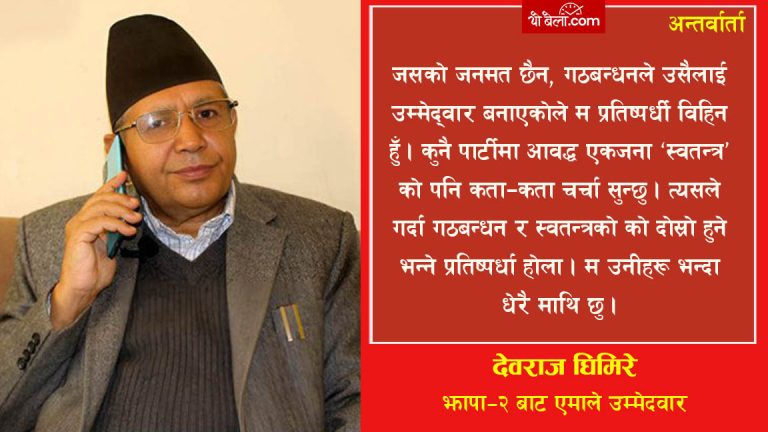 जसको जनमत छैन, गठबन्धनले उसैलाई उम्मेद्वार बनाएकोले म प्रतिष्पर्धी विहिन हुँ । कुनै पार्टीमा आवद्ध एक जना स्वतन्त्रको पनि कता–कता चर्चा सुन्छु । त्यसले गर्दा गठबन्धन र स्वतन्त्रको को दोस्रो हुने भन्ने प्रतिष्पर्धा होला । म उनीहरू भन्दा धेरै माथि छु।