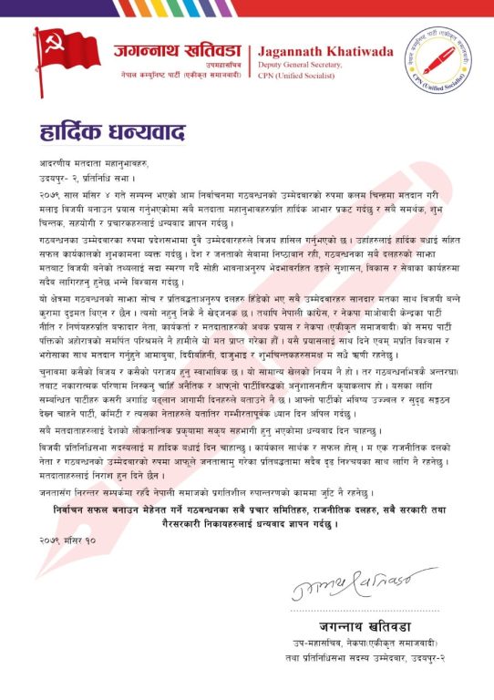 उदयपुर २ का मतदाताको नाममा पत्र लेख्दै खतिवडाले यस्तो पत्र लेखेका हुन् । उहाँ नेकपा एमालेका अम्मरबहादुर रायमाझीसँग पराजित हुनुभएको हो ।