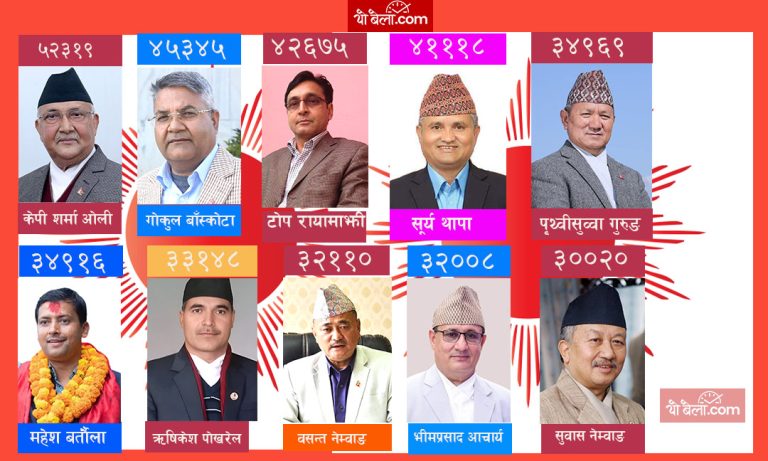 लमजुङ-१ बाट पृथ्वीसुव्वा गुरुङले ३४ हजार ९६९ मत, मकवानपुर २ बाट महेश कुमार बर्तौला ३४ हजार ९१६ मत, बैतडी १ बाट दामोदर भण्डारी ३३ हजार ६११ मत, धनुषा-३ बाट जुली कुमारी महतो (महासेठ) ३३ हजार ३५५ मत, मोरङ-२ बाट ऋषिकेश पोखरेलले ३३ हजार १४८ मत, सर्लाही-३ बाट हरि प्रसाद उप्रेती ३२ हजार ९३८ मत, पाँचथर १ बाट वसन्त कुमार नेम्वाङ्ग ३२ हजार ११० मत, भीमप्रसाद आचार्य, सुनसरी-२ बाट ३२ हजार ८ मत, पाल्पा-१ बाट नारायण प्रसाद आचार्य ३१ हजार १०३ मत, धनकुटा-१ बाट राजेन्द्र कुमार राईले ३० हजार १०१, सुवासचन्द्र नेम्वाङ इलाम-२ मा (३००२०) मत ल्याउनु भएको छ ।