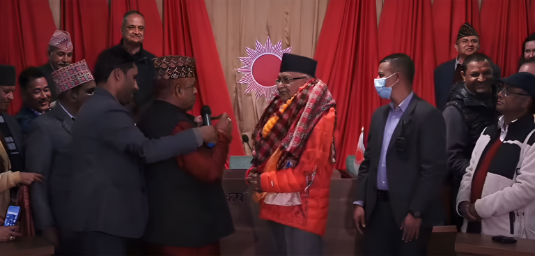 मन्त्रोच्चारणपछि पण्डित तिमिल्सिनाले अध्यक्ष ओलीलाई रुद्राक्षको माला पनि लगाइदिएका थिए ।