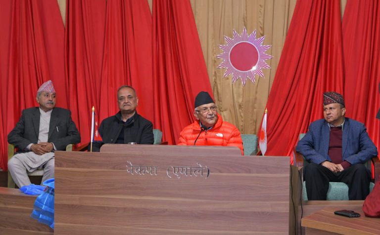 पार्टी कार्यालय च्यासल ललितपुरमा नवनिर्वाचित सांसदहरूलाई सम्बोधन गर्दै अध्यक्ष ओलीले चुनाव शान्तिपूर्ण वातावरणमा सम्पन्न हुनुपर्ने बताउँदै भयमुक्त रूपमा जनताले अभिमत प्रकट गर्न नपाएको बताउनु भयो ।