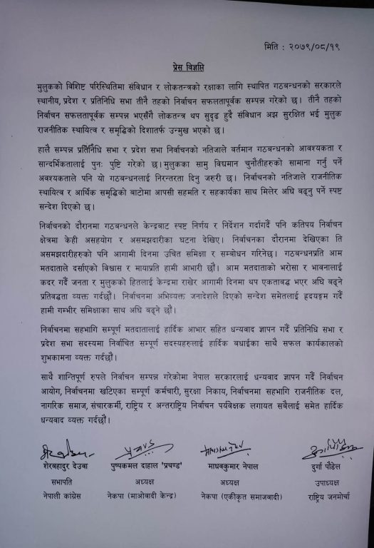 “निर्वाचनको दौरानमा गठबन्धनले केन्द्रबाट स्पष्ट निर्णय र निर्देशन गर्दागर्दै पनि कतिपय निर्वाचन क्षेत्रमा केही असहयोग र असमझदारीका घटना देखिए । निर्वाचनका दौरानमा देखिएका ती असमझदारीहरूको पनि आगामी दिनमा उचित समीक्षा र सम्बोधन गरिनेछ”, शीर्ष नेताहरूद्वारा हस्ताक्षरित विज्ञप्तिमा जनाइएको छ ।