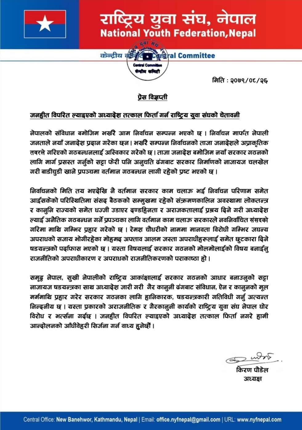 सरकारले मुलुकी फौजदारी कार्यविधि संहिता पहिलो संशोधन अध्यादेश २०७९ जारी गर्ने निर्णयको युवा संघले आपत्ति जनाएको हो।